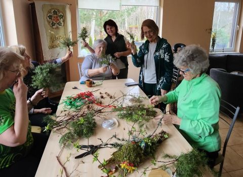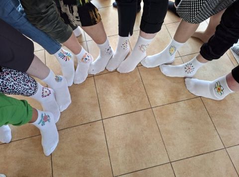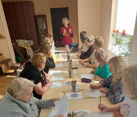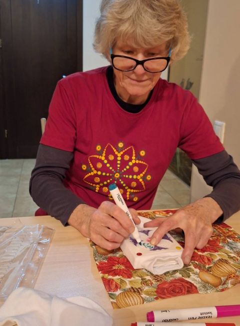 Dailės terapijos mokytoja Felicija veda kojinių dekoravimo edukaciją