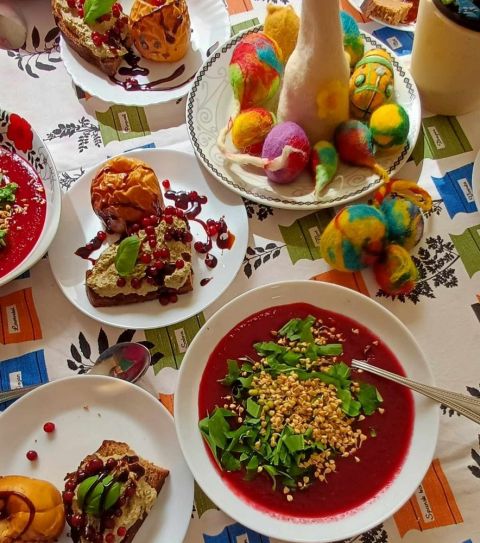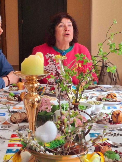 Pietų stalas, papuoštas nusiveltais margučiais.