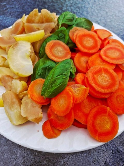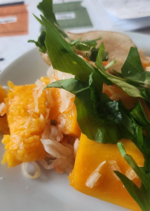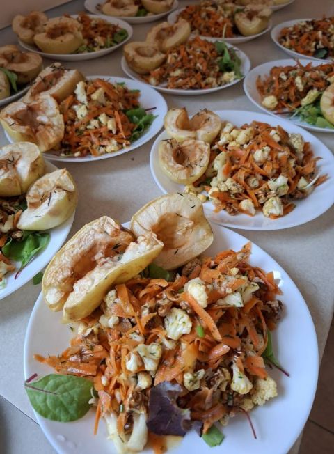Salotos ,,Rudenėlis". Morkos, fermentuotos apelsinų sultyse, žiedinis kopūstas, graikiniai riešutai, gardinta šaltalankių ir kanapių aliejais
