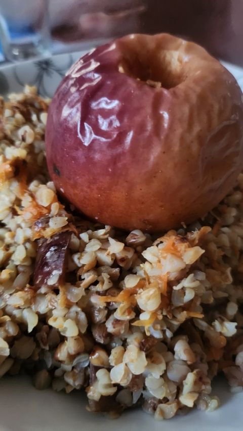 Vakarienė. Pagerbėm šviesaus atminimo Mokytoją Ksaverą Vaištarienę. Grikiai ir keptas obuolys - ji taip mėgo ir vertino šį valgį.