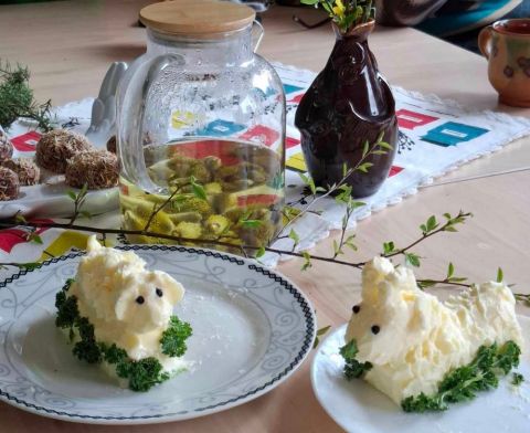 Močiutės Gražina-Viktorija ir Felicija iš sviesto lipdo Velykų avinėlį